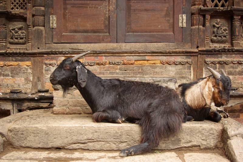 Goats and wood carvings by a temple in Bhaktapur.