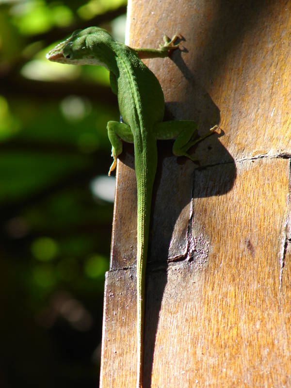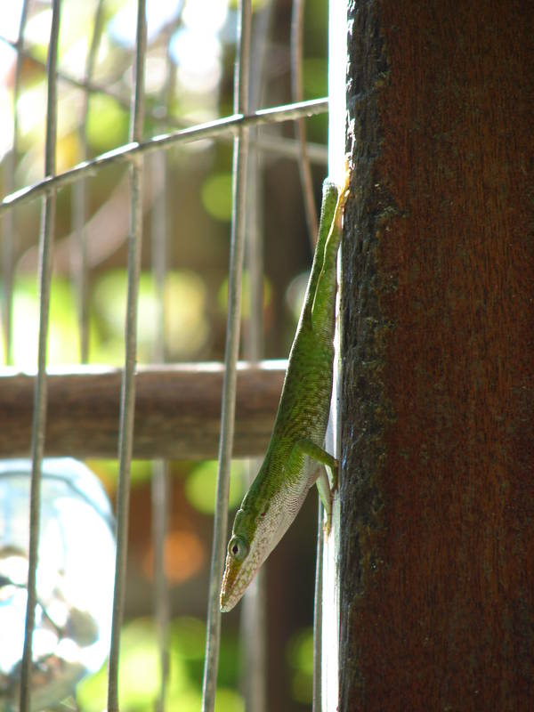Anole lizard climbing a wooden pillar, Havana.