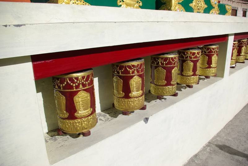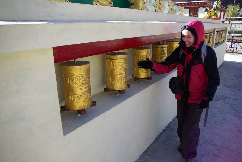 Edel by the prayer wheels in the Buddhist stupa in Tabo village.